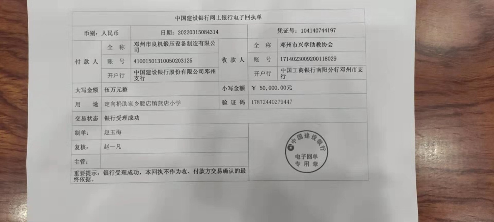 情系学子,真爱永恒。3月15日,邓州市政协常委、邓州市良机锻压设备制造有限公司董事长赵普良向邓州腰店镇燕店小学捐助5万元爱心助学款,为家乡教育事业发展捐资助力。